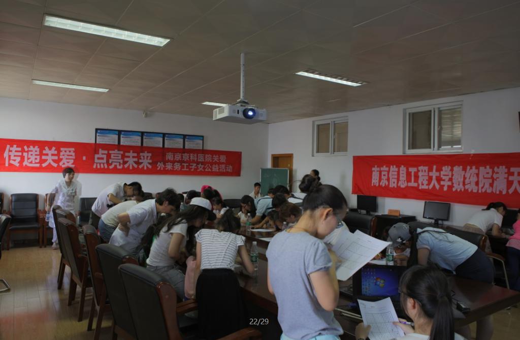本次活动,由南京妇儿堂医院院长陈琳、门诊医师范晓健领队的南京妇儿堂医院慈善义工队借助南京信息工程大学教学资源,给这些孩子策划了一场特别的“大学之旅”。妇儿堂慈善义工队上午给孩子们讲解课本知识,下午则进行魔方、剪纸、DIY、魔术等各类兴趣课程。最后还参观了南京信息工程大学的最新科研成果“FJ2型日照计”等。