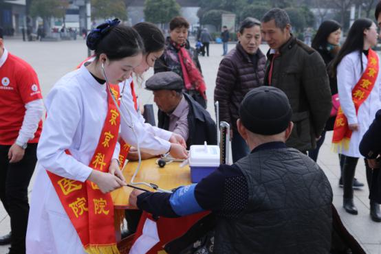 义诊现场,很多过往的乘客和附近的居民排着队咨询。美丽的天使医疗队员们耐心地为每一名居民答疑解病、真情服务。早春三月,乍暖还寒,但医疗队员的专注与热情温暖了广大群众的心!